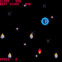 - Powerups are finaly here ! There are three types of powerups that you can pickup during your flight: slow-motion, which sets the speed to 1 during 5 seconds, the speed boost, which sets the speed to 10 during 2 seconds, and the shield, which spawns an energy shield around your spaceship and protects you from the meteorites during 5 seconds.